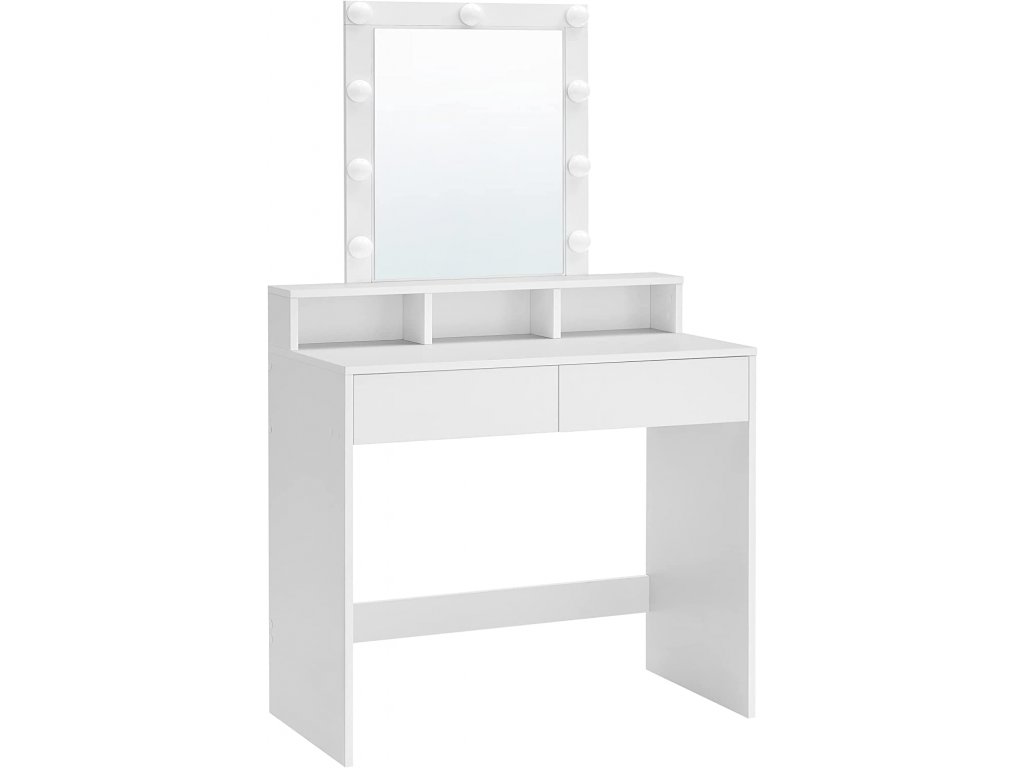 Jestliže však potřebujete vybrat toaletní stolek se zrcadlem a žárovkami, vyberte si ten se třemi otevřenými poličkami a dvěma velkými zásuvkami.